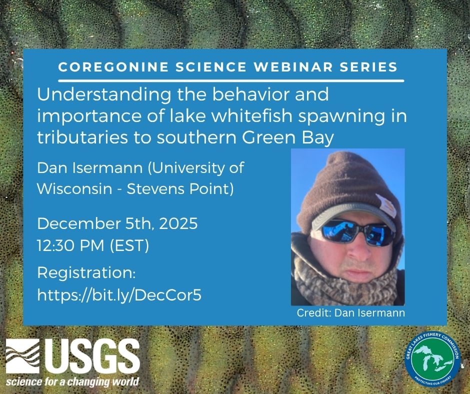 Please join us for the next installment of the Coregonine Science Webinar Series, Friday December 5th at 12:30 pm EST. Dan Isermann (University of Wisconsin – Stevens Point) will present “Understanding the behavior and importance of lake whitefish spawning in tributaries to southern Green Bay.” Join by registering at the link below.