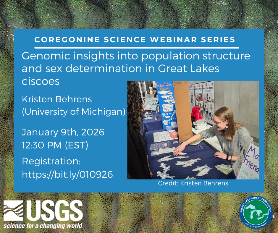 Please join us for the next installment of the Coregonine Science Webinar Series, Friday January 9th at 12:30 pm EST. Kristen Behrens (University of Michigan) will present “Genomic insights into population structure and sex determination in Great Lakes ciscoes.” Join by registering at the link below.